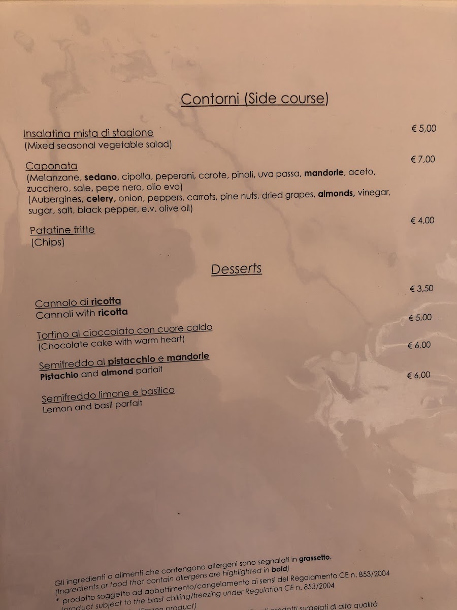The contorni are equally impressive, with highlights such as the Caponata Di Verdure and a refreshing Insalatina Di Pomodorini Con Burrata Di Bufala. Don’t miss the delightful desserts, including the iconic Cannolo Di Ricotta, which epitomizes Sicilian indulgence.